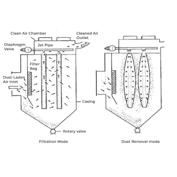 Para garantizar que las bolsas no se obstruyan con polvo, se utiliza un mecanismo de limpieza para eliminar el polvo de las bolsas filtrantes a intervalos regulares. Por lo general, esto se hace usando aire comprimido, que elimina el polvo de las bolsas de filtro y lo envía a la tolva para su eliminación.